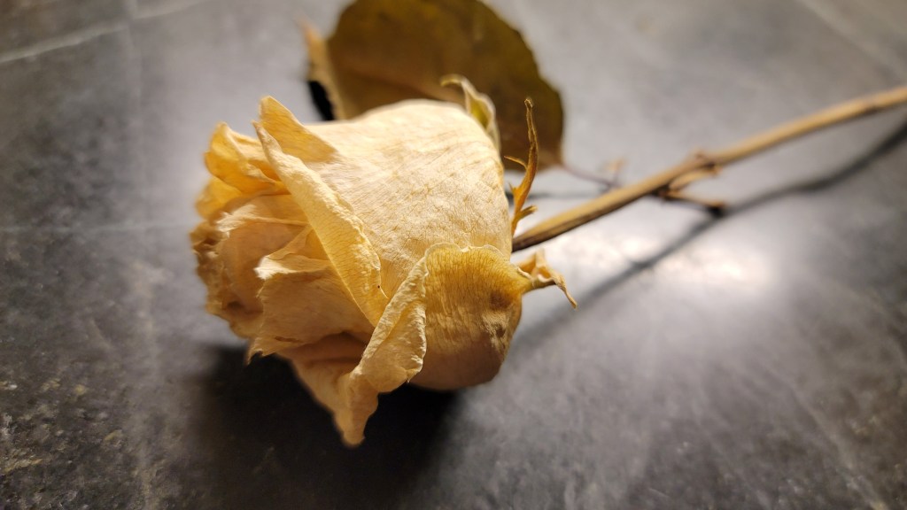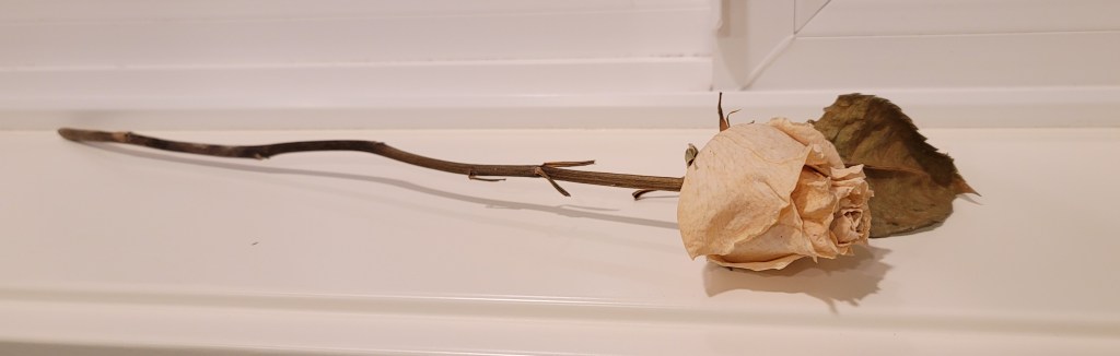 February 14th, 2022 – I take a single white dried rose and place it on my window sill, then look out into the dense darkness that shrouds the morning dawn.